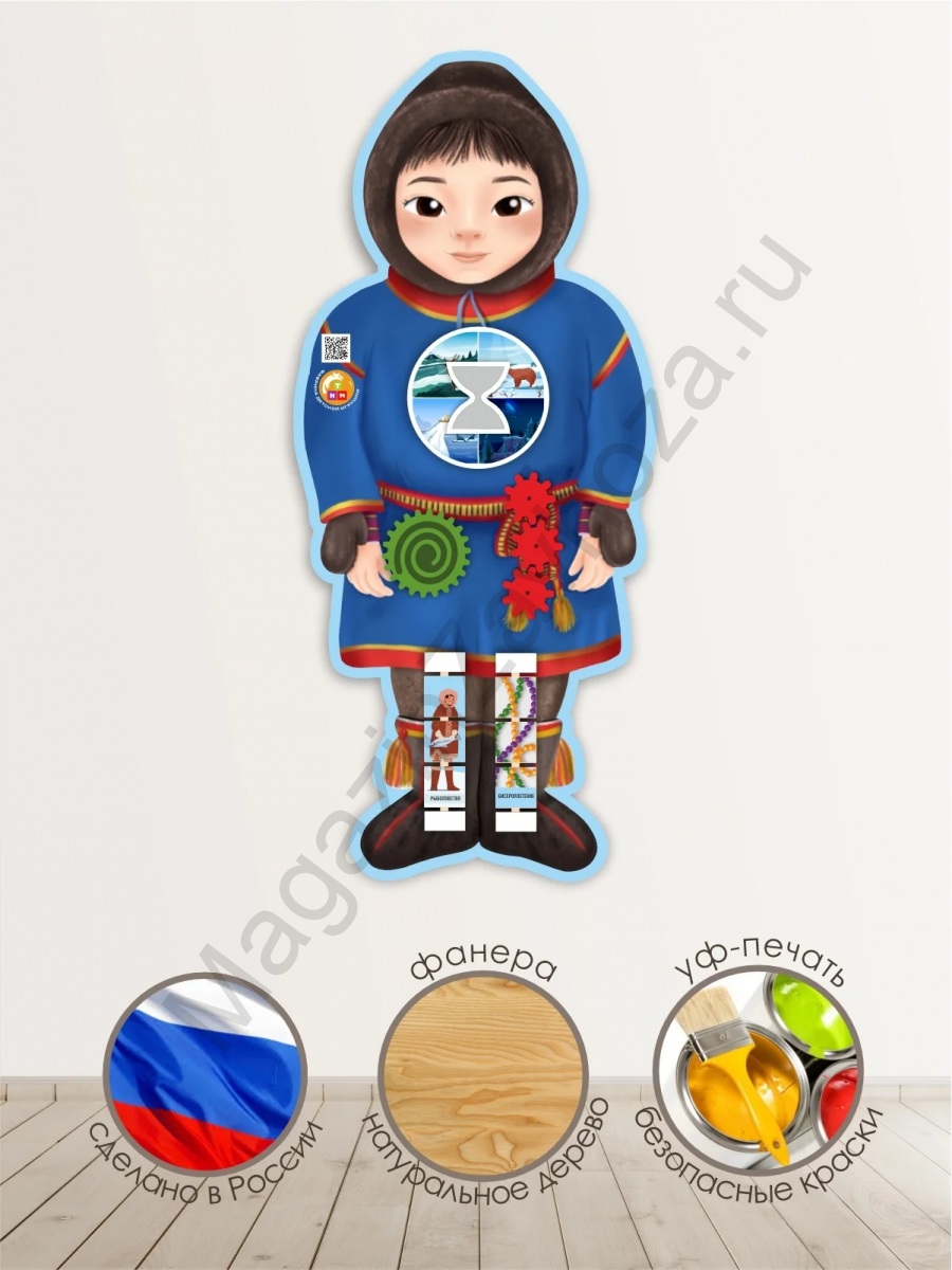 Бизиборд помогает познакомить детей с культурой народов Севера, развивать моторику, мышление, координацию и познавательный интерес через игровые механизмы. Размер: 817х358х50 мм