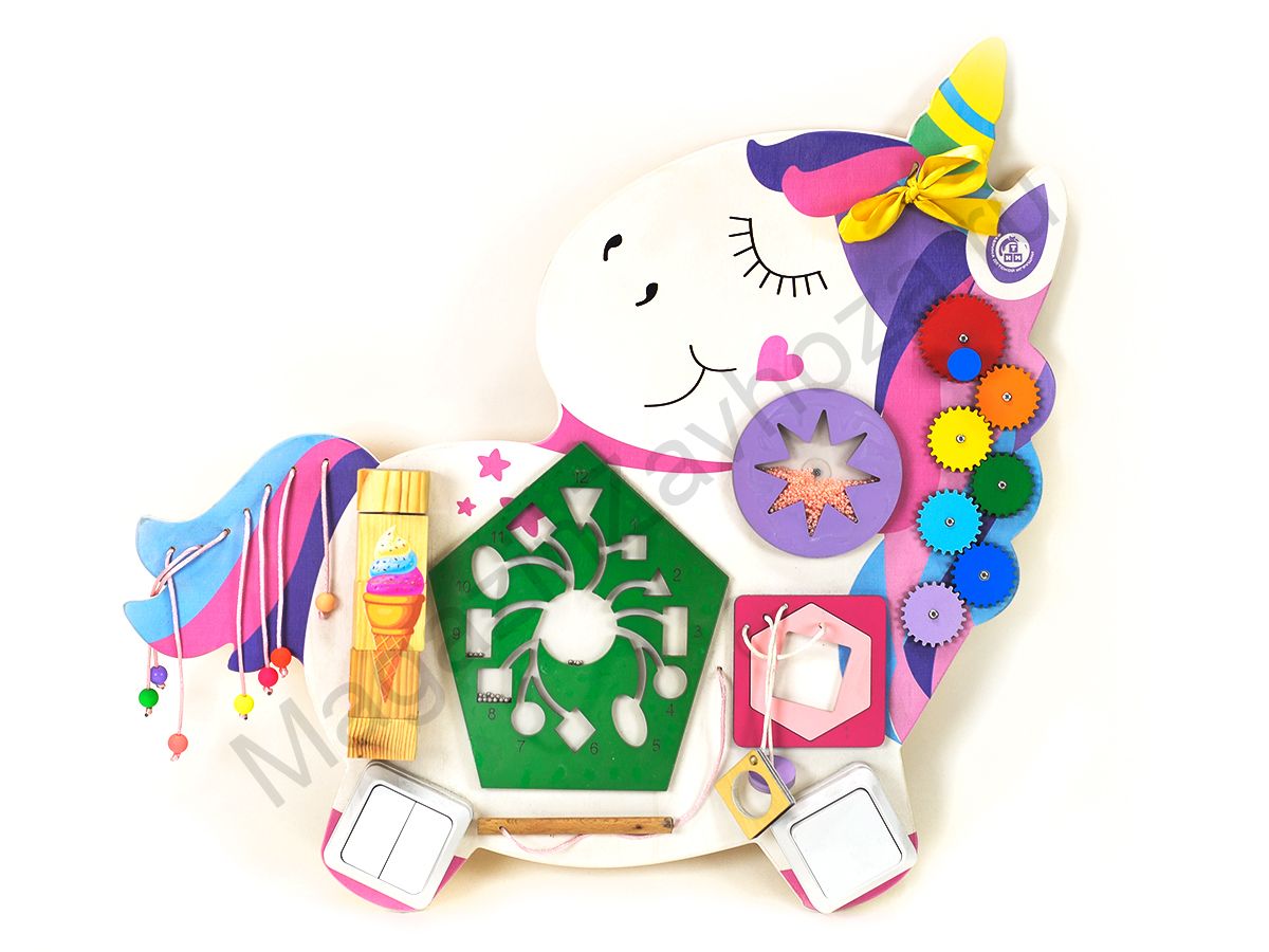 Бизиборды это увлекательные игровые панели для детей от 10 месяцев до 5 лет. Панель «РАДУЖНАЯ ЕДИНОРОЖКА» безопасна и полезна для детей. Малыши обожают изучать предметы, которыми каждый день пользуются взрослые. На бизиборде ребенку можно всё-всё:
