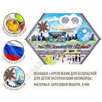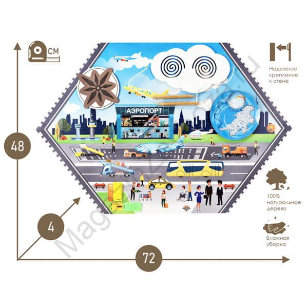 Размер бизиборда: 720*480*60 мм, он оснащен 4 крепежами для безопасной эксплуатации. Данный бизиборд можно купить как самостоятельную панель, так и в составе КМО Комплекта бизибордов и декоративных панелей для оформления стены ГОРОД ПРОФЕССИЙ (ИО-478).