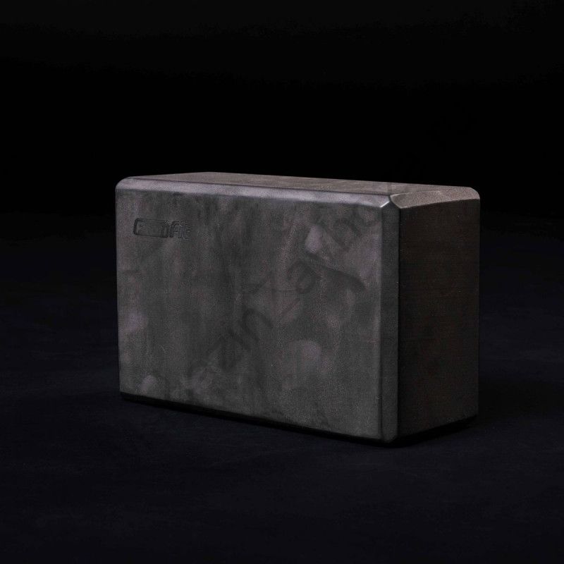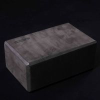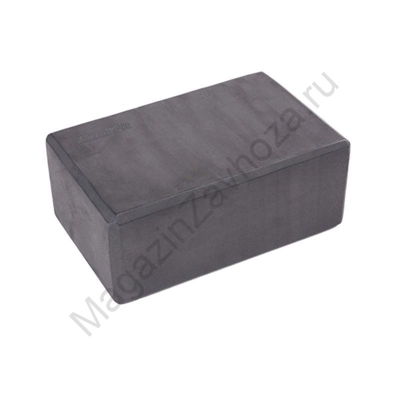 Опорный блок для занятий йогой, прямоугольной формы, черного цвета, сплошной конструкции без отверстий и полостей.
