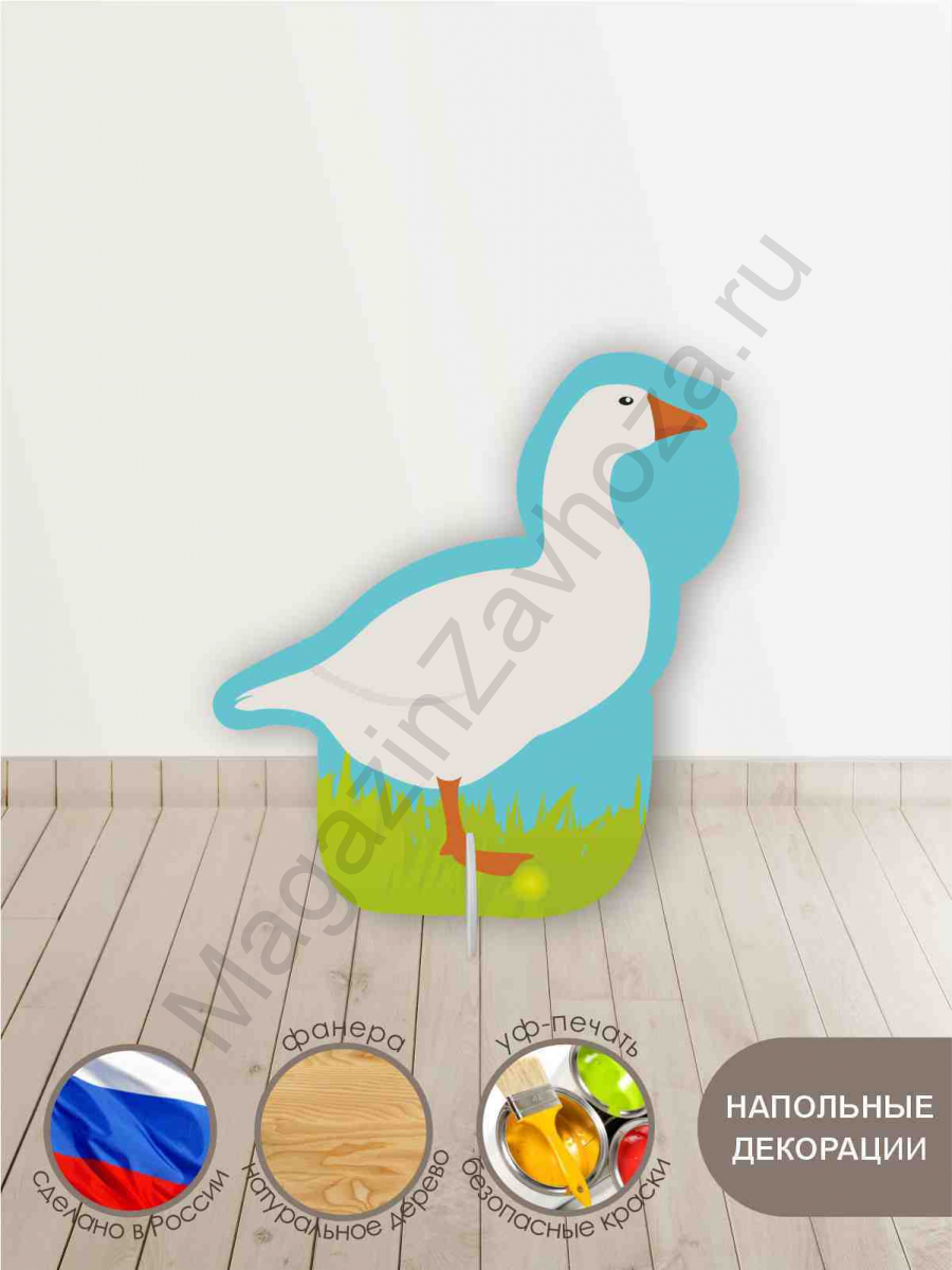 Напольная театральная декорация Гусь Размер декорации 455*350 мм Сделано в РОССИИ. Материалы: Фанера березовая 6 мм, марка – ФК, качество ½. Прочное покрытие, без запаха, гипоаллергенно, безопасно для детей. Прямая УФ печать по дереву (яркое изображение, не сотрется со временем). Все материалы экологичны, безопасны для детской продукции.