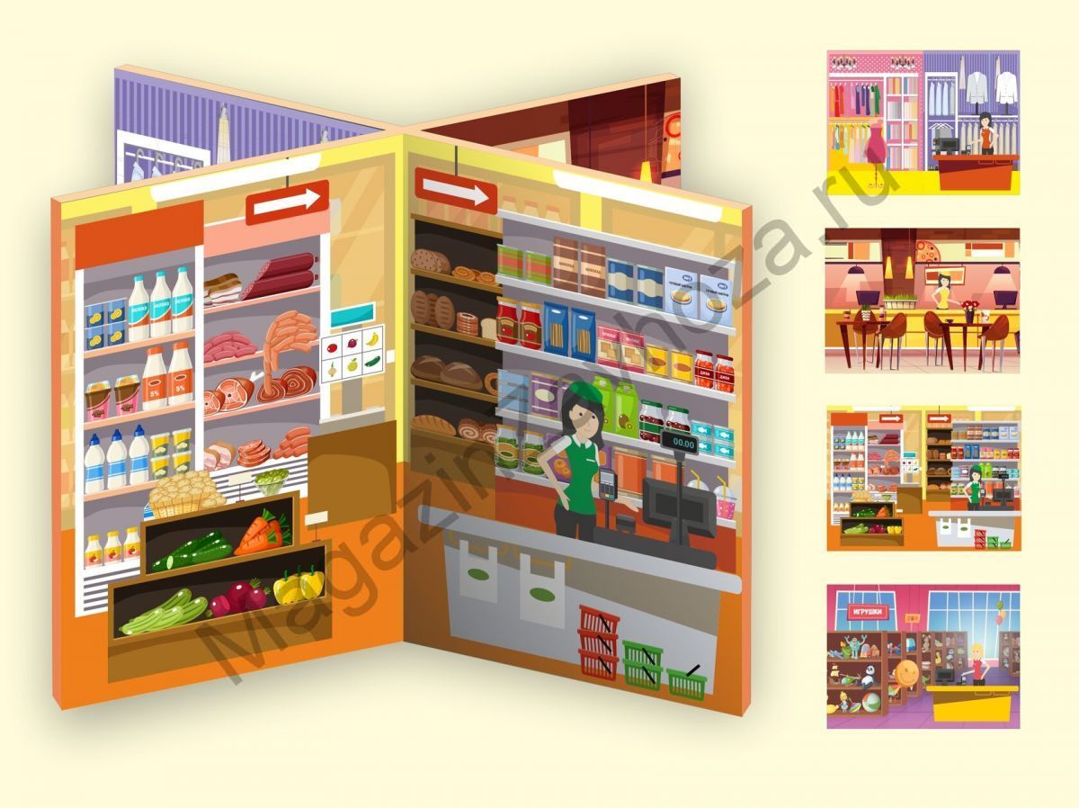 Ширмы-книги способствуют созданию тематического пространства ТОРГОВОГО ЦЕНТРА, а именно: ОТДЕЛ ПРОДУКТЫ, ОДЕЖДА, ДЕТСКИЕ ТОВАРЫ, КАФЕ.