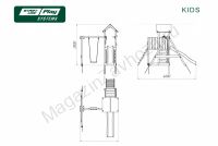 Модули:: башня высокая с лестницей, крыша из ткани, горка пластиковая длиной 220 см и высотой 1,2 м., 2 сидения для качелей с регулируемыми канатами, 4 металлических подвеса для качелей с карабинами, 5 ручек в форме камешков для скалодрома, 4 пластиковые ручки, спортивный руль, подзорная труба, наклонная лестница, вертикальный скалодром, встроенная песочница