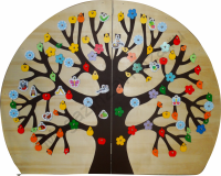 Дидактическая панель ВРЕМЕНА ГОДА настенная высотой 120 см, 150 см - шириной. можно установить как у стены, закрепив панели рядом, так и в углу комнаты, расположив панели под углом (крепеж для монтажа на стене — в комплекте). На панели 96 веточек-сучков для нанизывания элементов в форме листьев, цветов, плодов 7 цветов, а также элементов с изображением снежинок, насекомых и птиц (всего более 250 элементов).