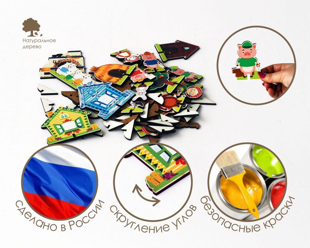 Материал — берёзовая фанера 6 мм, УФ-печать, лак на водной основе: экологично, безопасно, долговечно.
