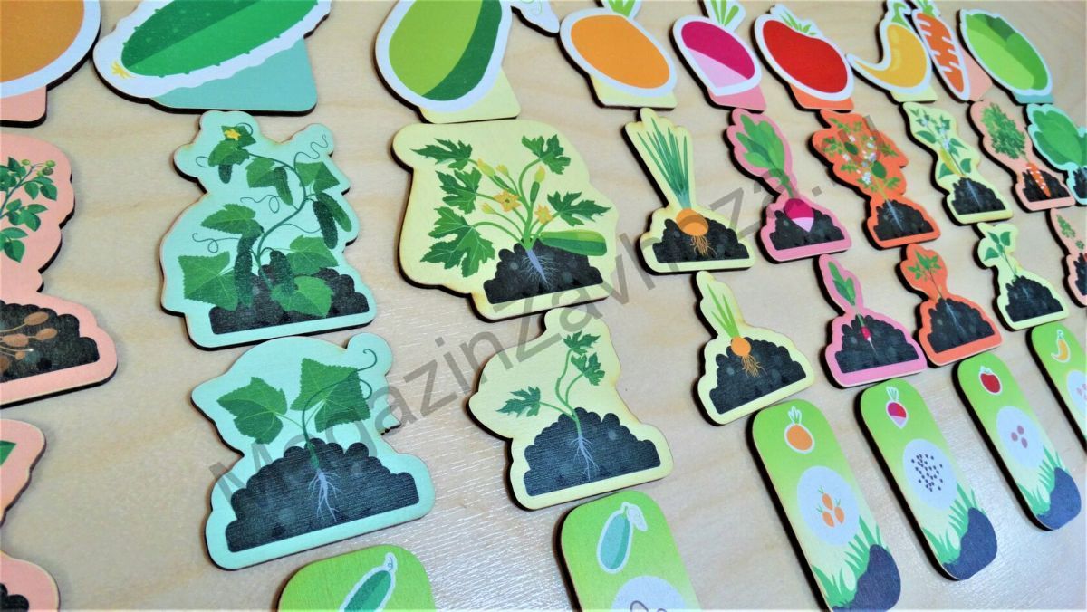 • каждый овощ представлен на 4 плашках: семена, росток, взрослое растение с зелеными не созревшими плодами, непосредственно - плод.
