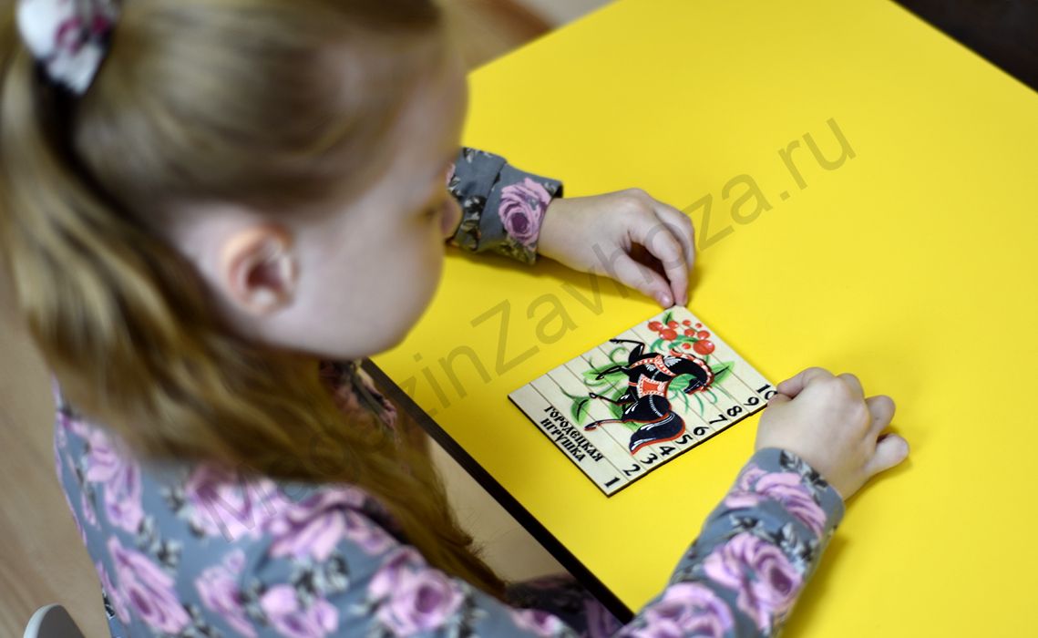 Дидактический набор состоит из 12 плашек с изображением русских народных игрушек. Каждая плашка разделена на 10 частей . В состав набора входит наглядный материал для сборки плашки.