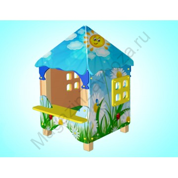 Домик – беседка  предназначен для детей дошкольного возраста от 2-х лет и представляет собой конструкцию в виде домика на стойках из клееного бруса  сечением 100х100 мм и имеющего скругленный профиль с канавкой посередине. Крыша домика состоит из 4-х скатов, выполненных из влагостойкой фанеры толщиной 18 мм с художественной росписью в виде голубого неба с облаками и солнцем. К башне с  крышей,  с высотой площадки 300 мм, пристроены: 2 боковые стенки с художественной росписью в виде цветочной поляны и накладными окошками,  одного входа и  прилавка с противоположной стороны. Нижняя часть столбов оканчивается металлической закладной, которая бетонируется в землю. Домик внутри оборудован двумя скамьями из влагостойкой фанеры ФСФ 18 мм с ребром жесткости под сидением.