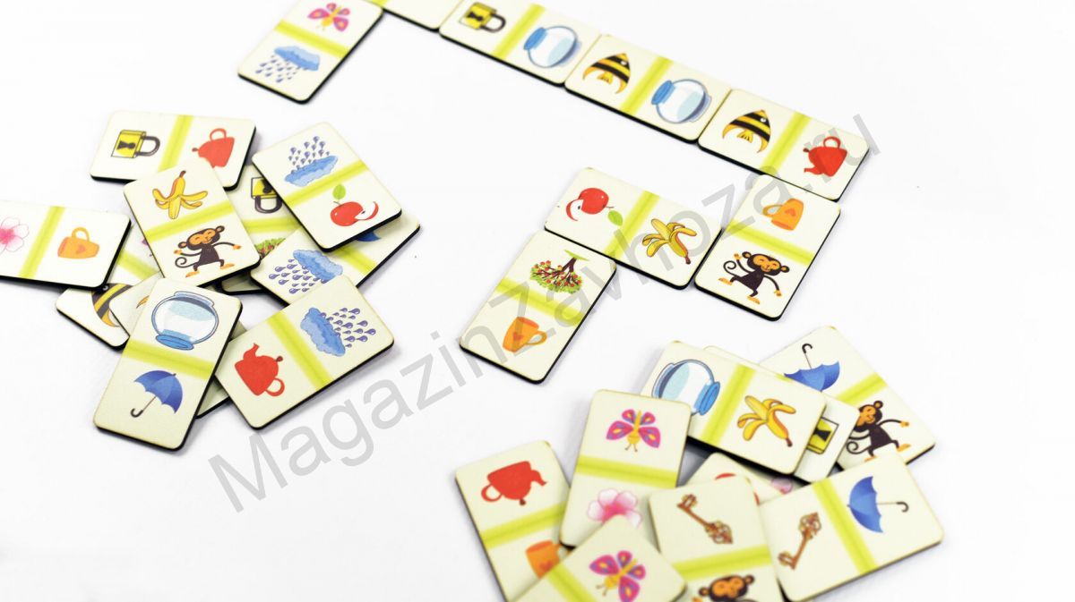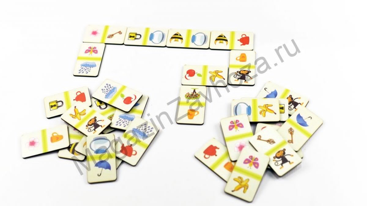 Игровой набор состоит из 28-ми деревянных карточек-домино. На каждой карточке по 2 картинки, изображающие животных, различные предметы и т.п., между которыми можно провести ассоциативные связи.