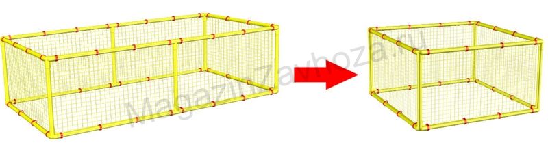 Дополнительные сетки для временного преобразования больших манежей в меньшие при необходимости. В этом случае за несколько минут можно снять большую сетку, убрать некоторые трубки и собрать уменьшенный манеж. Для уменьшения манежа 125 х 250 см.