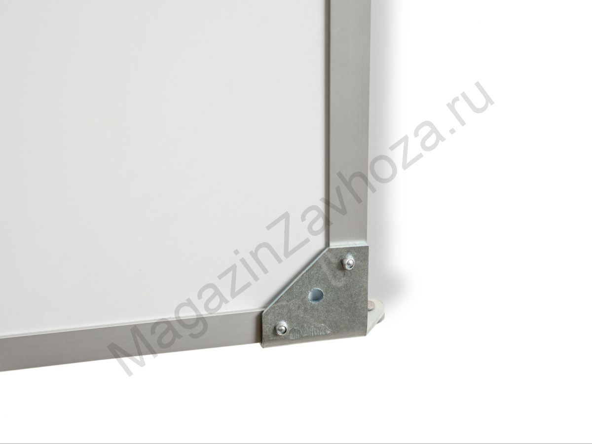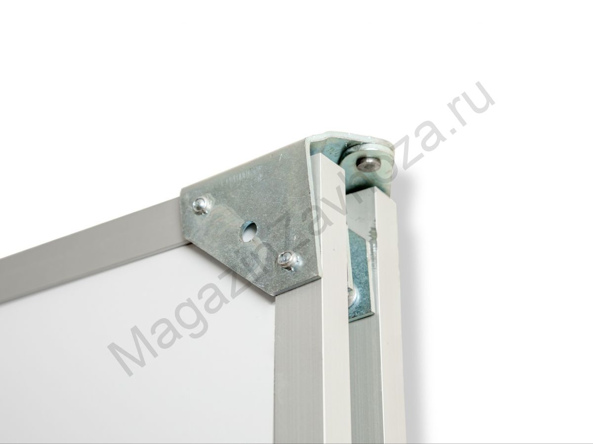 Рабочая поверхность изготовлена из стального полимерного листа, обрамление — высокопрочный алюминиевый профиль, благодаря чему имеет высокую износоустойчивость и прочность. Имеется лоток для мела/маркера и принадлежностей.