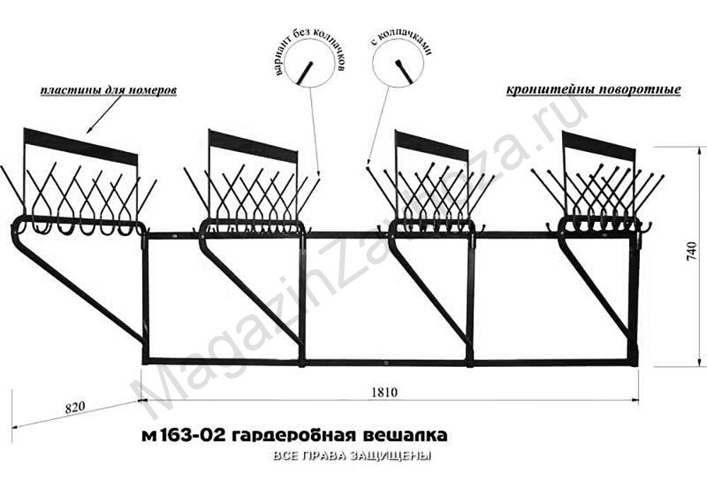 Четыре поворотных кронштейна снабжены 48 крюками для пальто и 48 крюками для шляп (12+12 на каждом кронштейне). Над крюками расположены пластины для надпечатки номеров. Вешалка поставляется в разобранном виде с колпачками *колпачки поставляются отдельно вместе с крепежом. Вешалка крепится на стене (бетон, кирпич) при помощи 4-х анкерных болтов повышенной грузоподъемности, которые максимально обеспечивают безопасность в эксплуатации данного изделия. Каркас: сталь, цвет только черный в других цветах заказ от 10 шт. Размер товара (Ш*Г*В, мм): Длина - 1,8 м. Высота - 0,74 м. размах поворотного кронштейна - 0,82 м. размер планки под номерки 663*43 Оптимальная упаковка (Ш*Г*В, мм): рама картон 1830*500*60h + кронштейн п/п 780*760*300h Объем, м3: 0,233 м3 Вес: 18 кг Поставляется в разобранном виде!