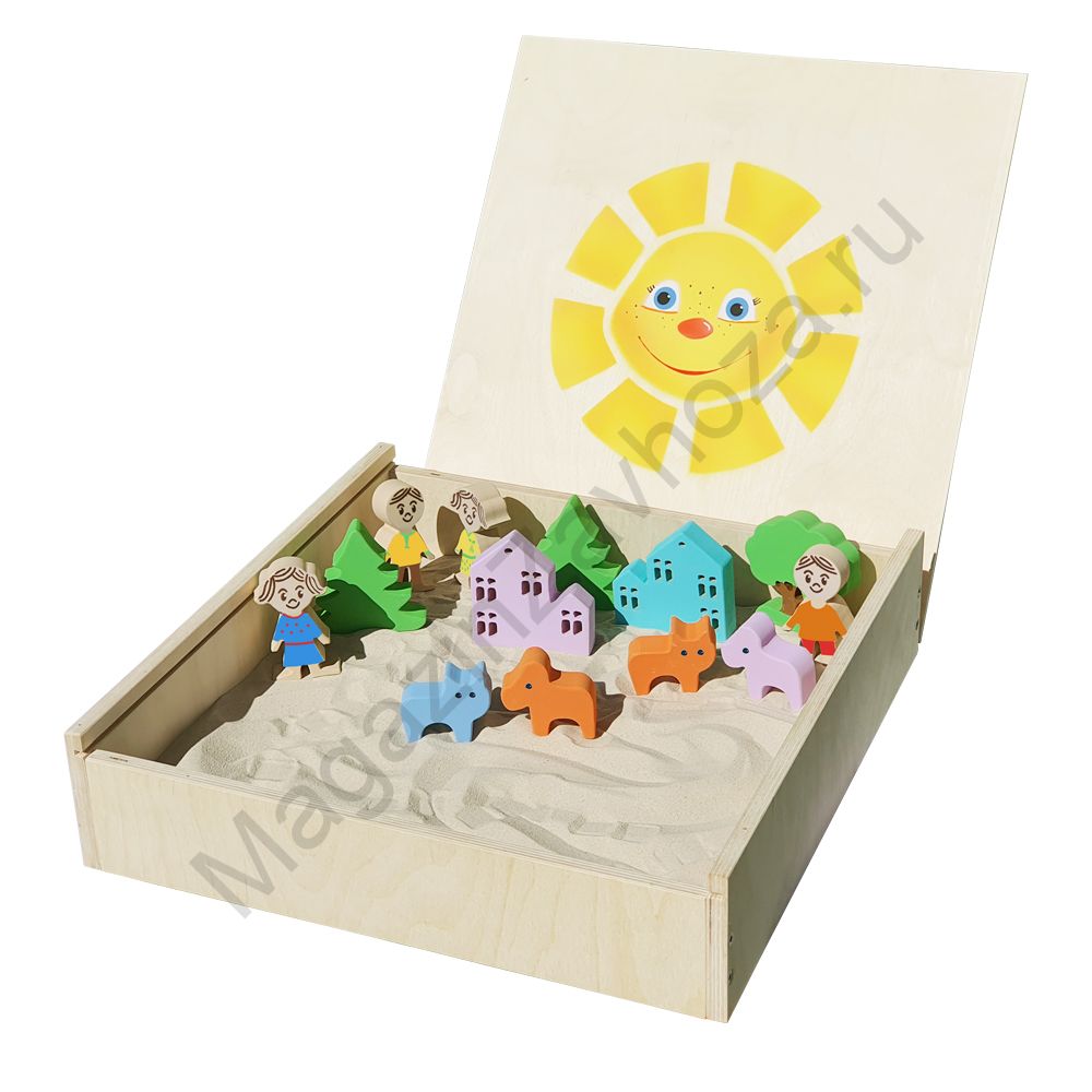 Фанера 15мм, лак или краска. Цвет можно выбрать Выдвижная крышка с трафаретным рисунком. Песок кварцевый 5 кг. 13 фигурок МДФ 25мм Использовать сухой или слегка увлажнённый песок. Размеры: 500х500х120мм Вес: 9кг Объём:0,03м/куб.