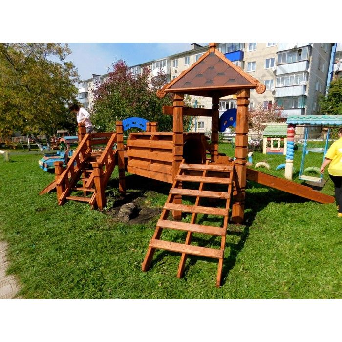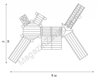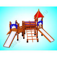 Конструкция имеет очень привлекательный внешний вид. А своей оригинальностью и предвкушением массы веселых забав, как магнитом, притянет всю окрестную детвору. Чтобы сделать скольжение на горках максимально безопасным, скаты имеют специальное пластиковое покрытие. Вся конструкция (габариты 8*5*3,2 м) выполнена из натуральной древесины, обработанной антисептическими средствами.