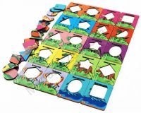 Развивающая игрушки представляет собой красочно оформленные деревянные пластины (20 штук) с пазами посередине, имеющими геометрическую форму. Необходим вложить ту фигуру в паз пластины, которая походит по форме, размеру и соответствует общему рисунку.