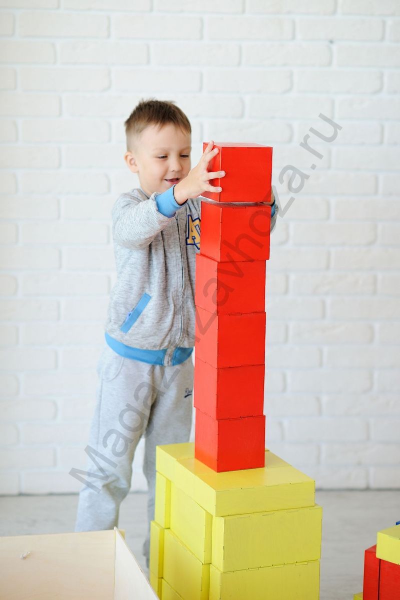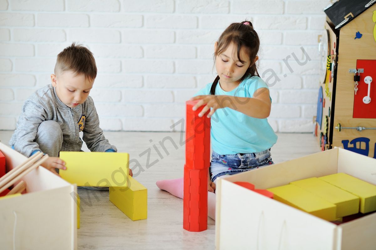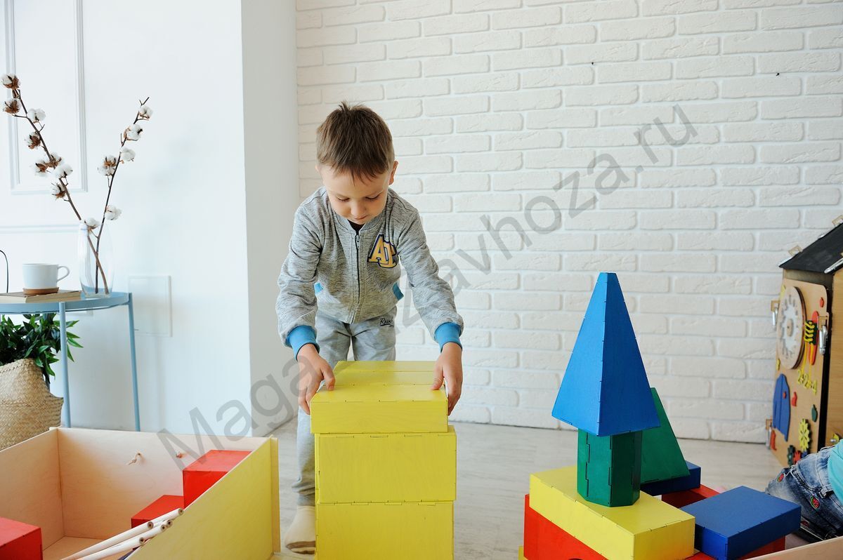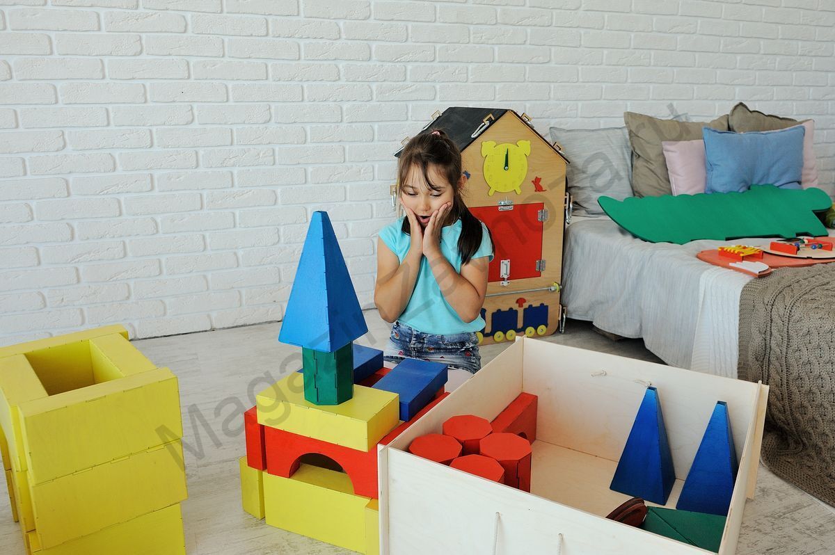 В комплект входят все необходимые детали для строительства домов, машин в полный детский рост. Всего 13 видов геометрических фигур. Они выполнены в классических цветах.
