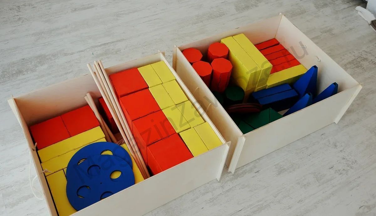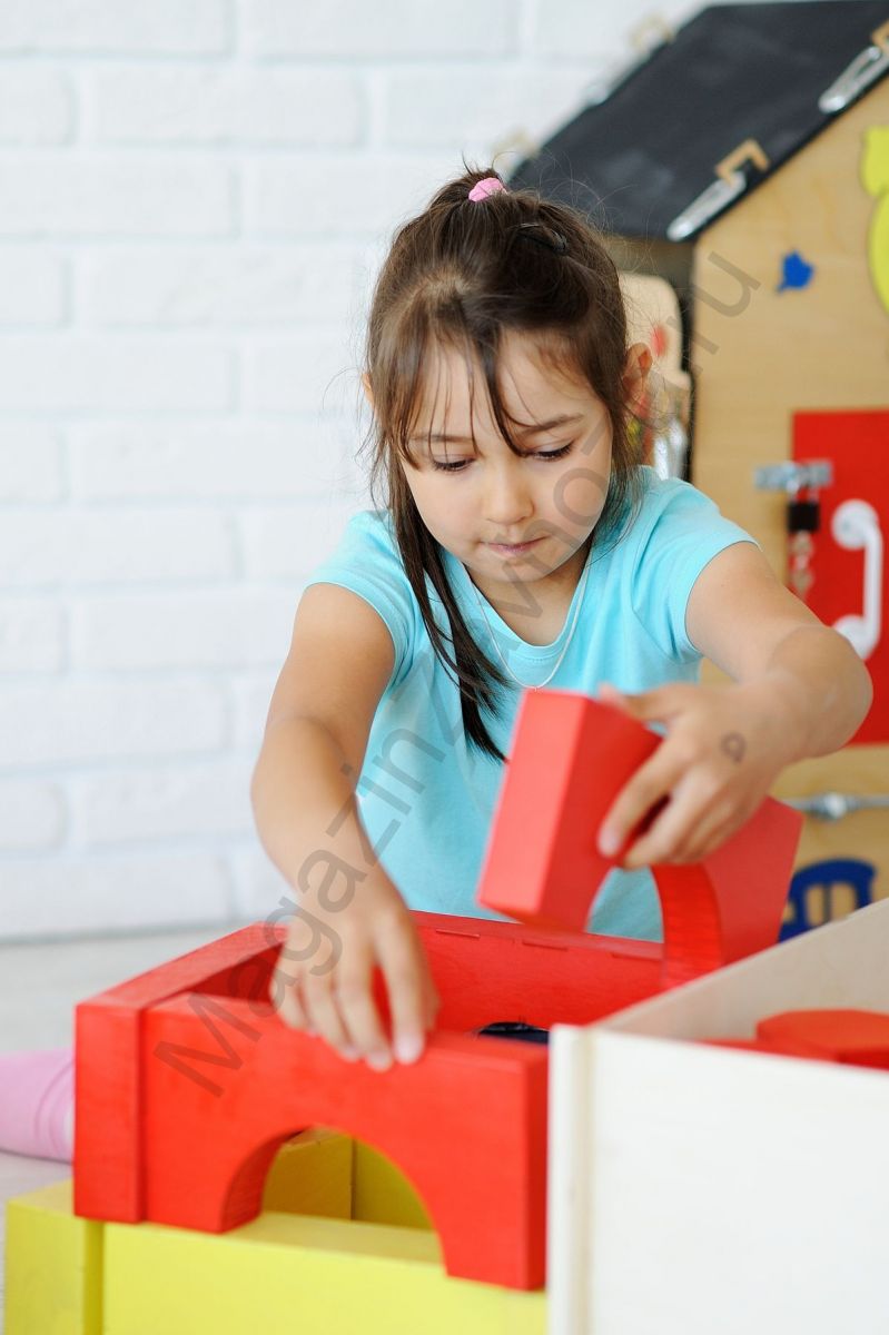 В комплект входят все необходимые детали для строительства домов, машин в полный детский рост. Всего 13 видов геометрических фигур. Они выполнены в классических цветах.