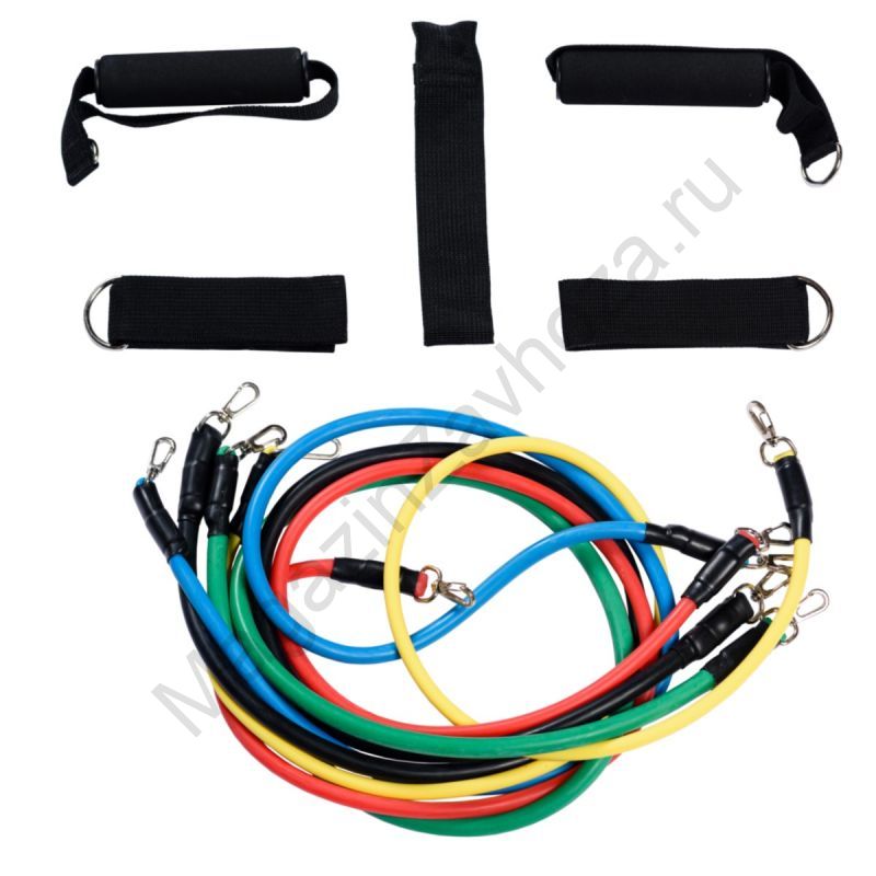 В состав комплекта входят две мягкие нескользящие эргономичные рукоятки, два ремешка, блок для фиксации эспандера в дверном проеме и мешок для хранения.