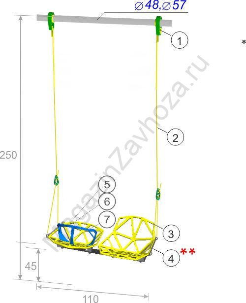 Предназначены для подвешивания на опорную конструкцию с диаметром перекладины 38 мм, 48 мм и 57 мм. Детские поручни в комплекте.