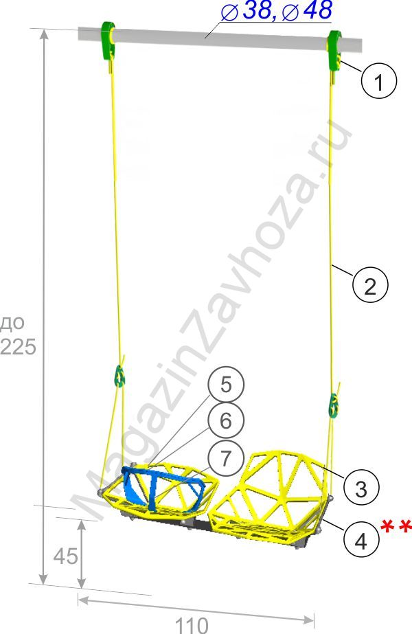 Предназначены для подвешивания на опорную конструкцию с диаметром перекладины 38 мм и 48 мм. Детские поручни в комплекте.