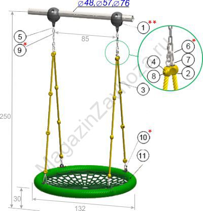Качели-гнездо 132 см высота канатной системы 250 см с креплением на трубу 57 мм и 76 мм или к потолку