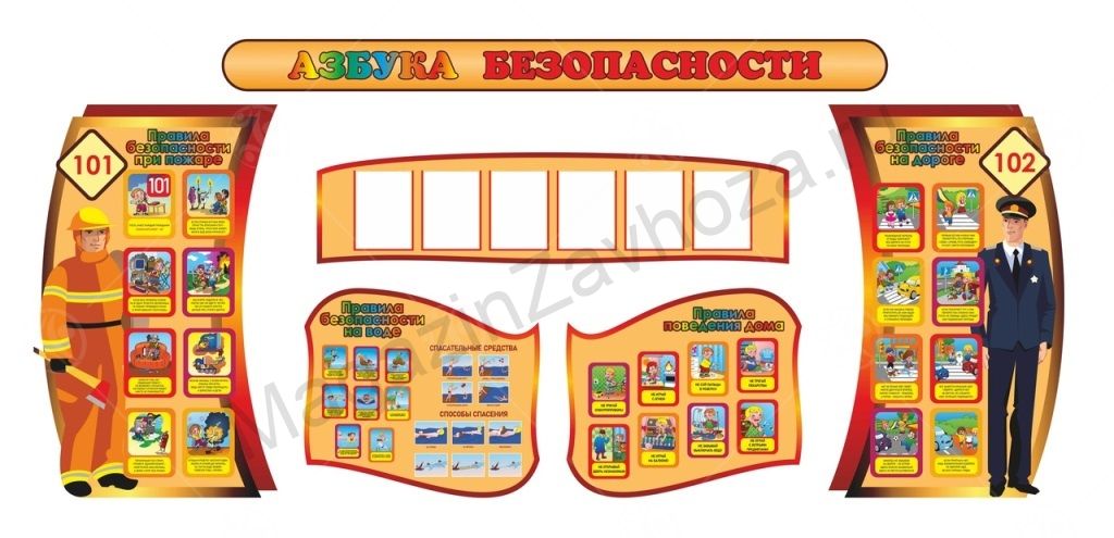 Комплект стендов "Азбука безопасности" состоит из шести отдельных элементов. Размер цельной композиции 3,9*1,8м. В стендах присутствует иллюстрированная информация по технике безопасности: правила безопасности нпри пожаре, на воде, дома, на дороге. Информация указанная на стенде актуальна для всех организаций. И отлельная часть композиции стендов с шестью карманами А4. тенды можно заказать как композицией, так и по отдельности.