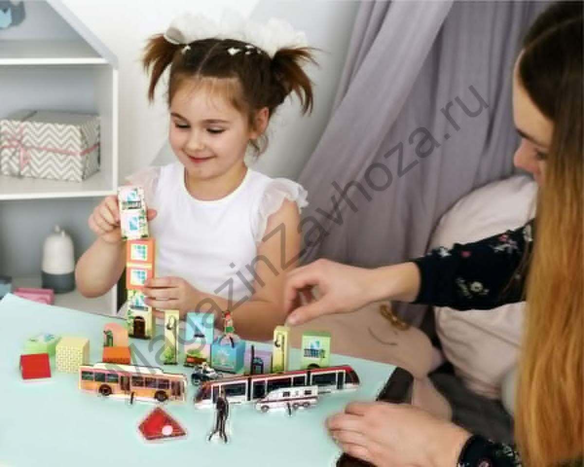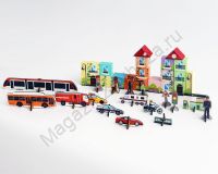 Поставляется в 1 картонной коробке (21,5*17,5*4 см). Данный конструктор двусторонний, он позволяет построить современный городок с элементами малых архитектурных форм. Также в состав конструктора входят фигурки транспорта, заправочной станции и станции метро, дорожных знаков и людей. В наборе 50 деталей. Игрушка изготовлена из высококачественных материалов, покрыта нетоксичной краской на водной основе и совершенно безопасна для детей.