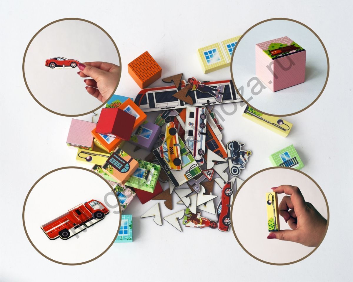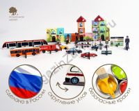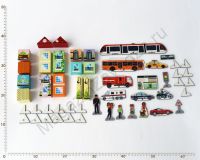 Также в состав конструктора входят фигурки транспорта, заправочной станции и станции метро, дорожных знаков и людей.