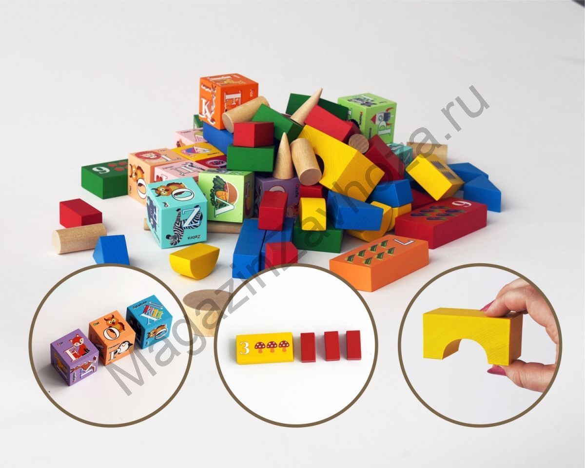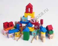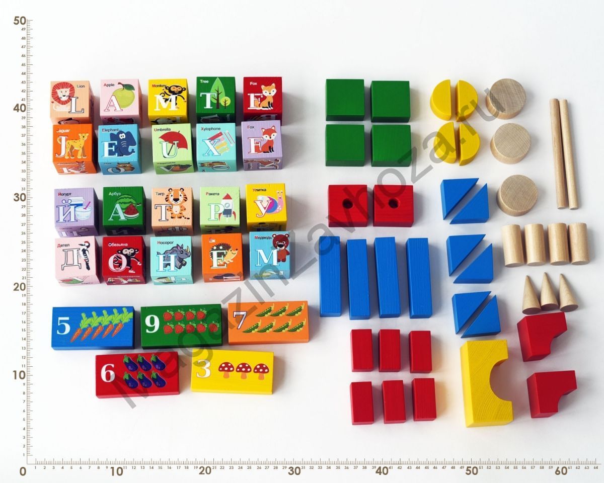 В наборе 64 разнообразных ярких деталей с изображением азбуки на 2 языках и цифр. В этом конструкторе Вы найдете как классические деревянные детали, окрашенные в яркие цвета и имеющие разнообразные формы, так и деревянные кубики и кирпичики с напечатанными буквами и цифрами.