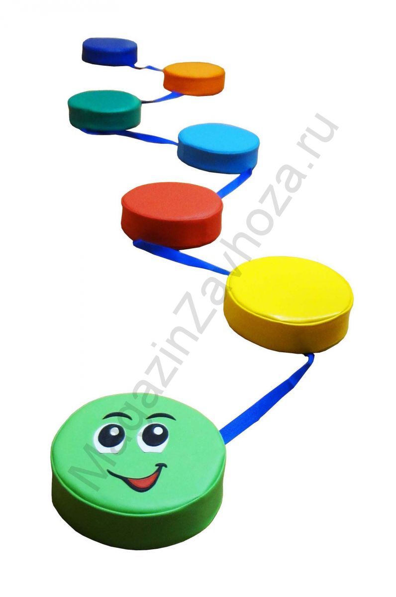 Размер (см): 24*10. Змейка-шагайка состоит из семи мягких ярких таблеток, соединенных между собой стропой. Малыши с радостью будут шагать или прыгать с одной подушки на другую. Занятие на дорожках помогают улучшить координацию движений, ловкость, устойчивость, развивает опорно-двигательный аппарат.