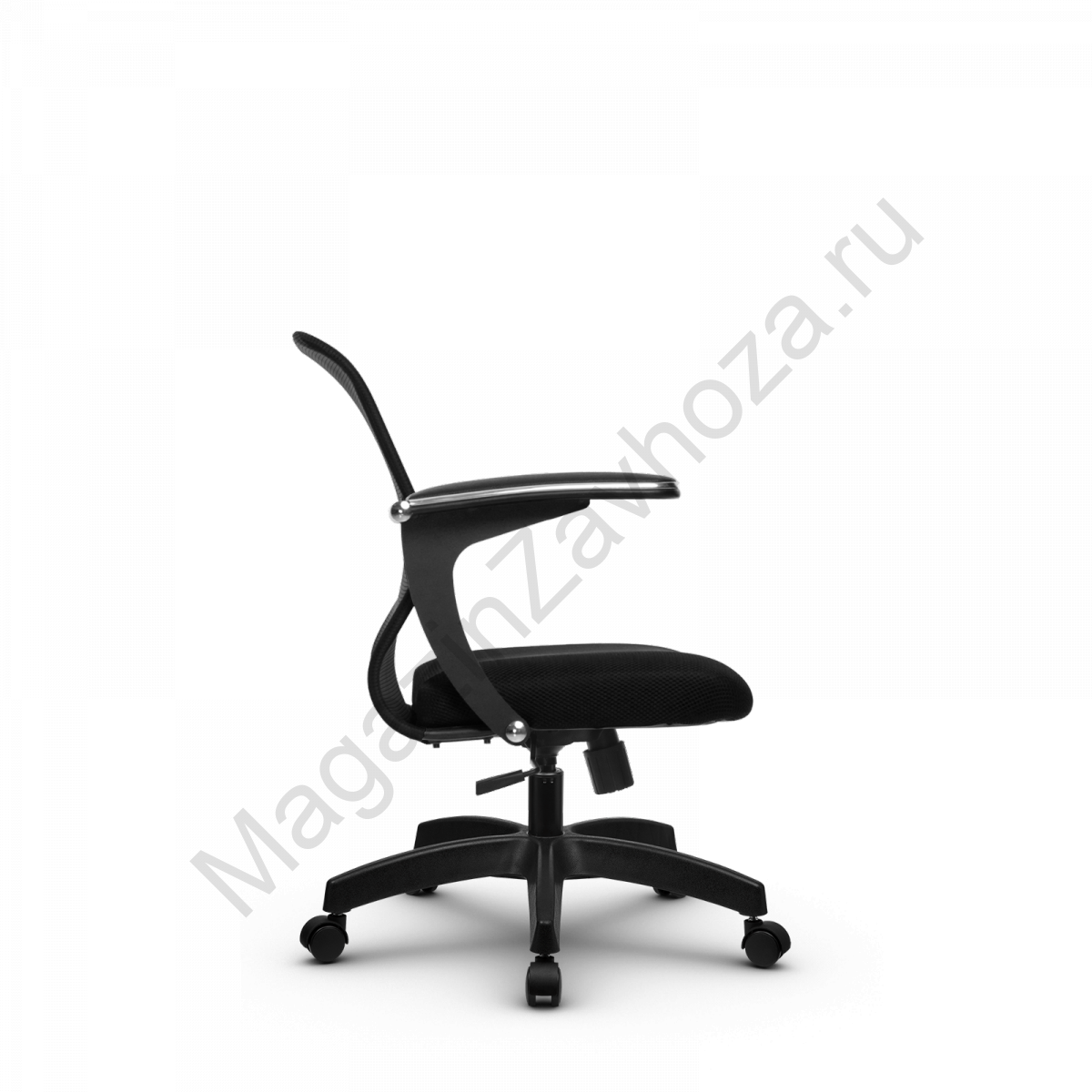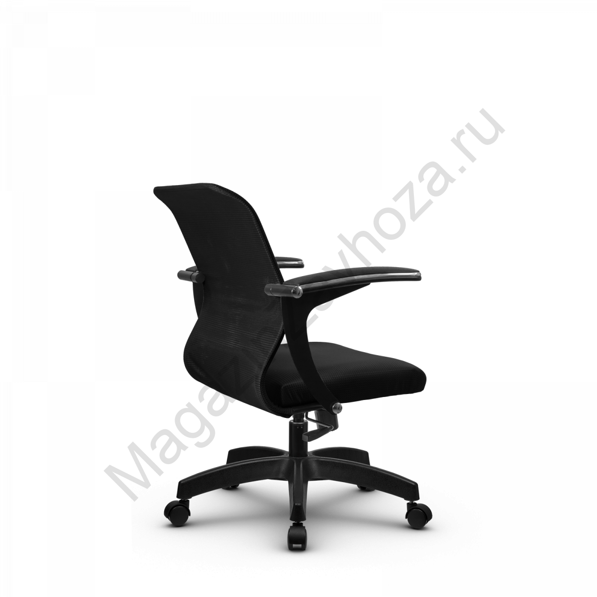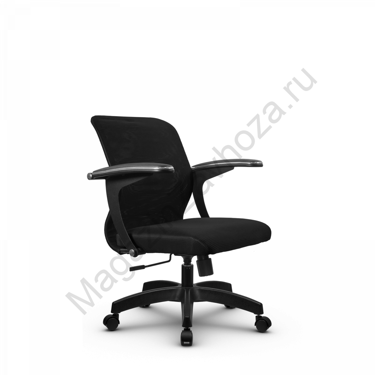 "Спинка: низкая, черное полимерное покрытие каркаса, высота 490 мм, ширина 440 мм Вид обивки спинки: сетка натяжная без прошивки (сетка Х2) Подлокотники: "Бумеранг", стальные с полимерным покрытием черного цвета, c хромированным молдингом, с мягкими накладками Обивка накладок: экокожа Сиденье: мягкое обьемное на столярном каркасе, ширина 440 мм Вид обивки сиденья: износостойкая ткань обивочная сетчатая без прошивкиМеханизм качания: Пиастра Газ-лифт: стальной хромированный Пятилучье: пластиковое, цвет черный D - 650 мм.Ролики: полиамидные, d - 50 мм"