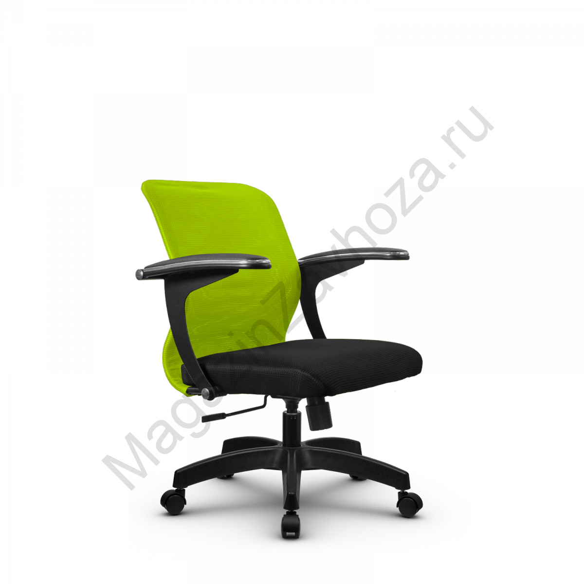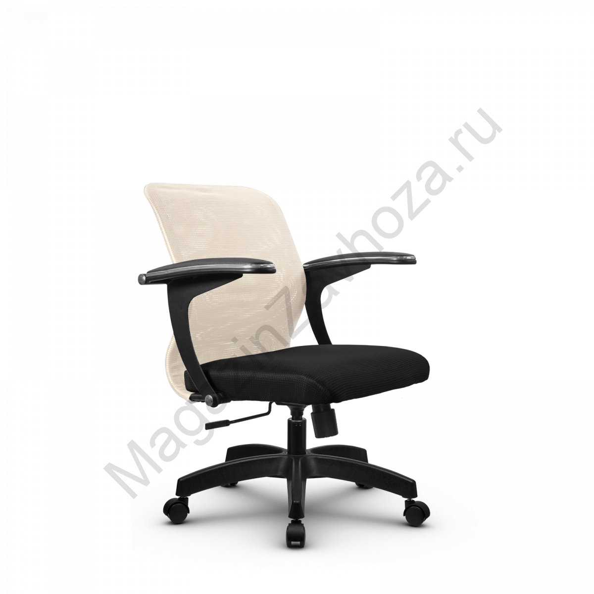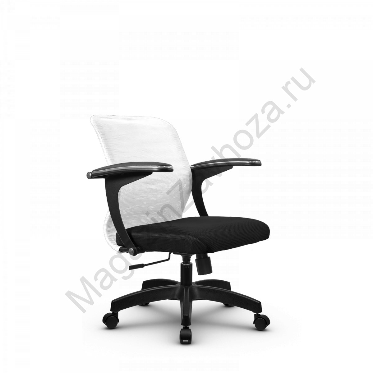 "Спинка: низкая, черное полимерное покрытие каркаса, высота 490 мм, ширина 440 мм Вид обивки спинки: сетка натяжная без прошивки (сетка Х2) Подлокотники: "Бумеранг", стальные с полимерным покрытием черного цвета, c хромированным молдингом, с мягкими накладками Обивка накладок: экокожа Сиденье: мягкое обьемное на столярном каркасе, ширина 440 мм Вид обивки сиденья: износостойкая ткань обивочная сетчатая без прошивкиМеханизм качания: Пиастра Газ-лифт: стальной хромированный Пятилучье: пластиковое, цвет черный D - 650 мм.Ролики: полиамидные, d - 50 мм"
