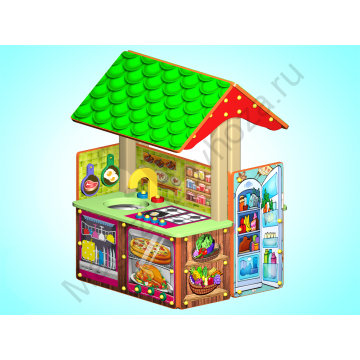Кухня двухсторонняя выполнена в виде устойчивой, модульной конструкции и состоит из игровых и развивающих элементов, обеспечивающих ребенку комфортные условия для игры на открытом воздухе. Конструкция  состоит из башни с крышей в виде двойного навеса. К башне должны быть пристроены: столешница, перегородка, боковые стенки с художественным оформлением на заданную тематику - кухня. Кухня состоит из рабочей поверхности со столешницей, передних, боковых и задней стенок с художественным оформлением на заданную тематику. Кухня должна включать в себя: мойку выпуклой формы с краном, плиту с конфорками, духовку, посудомойку, разделочных досок. Несущие столбы должны быть выполнены из клееного деревянного бруса сечением не менее 100х100 мм и иметь скругленный профиль с канавкой посередине. Снизу кухня заканчивается подпятником из металлической профильной трубы 50*25, который бетонируется в землю. Стенки, столешница и боковые панели выполнены из влагостойкой  фанеры ФСФ толщиной 18мм.