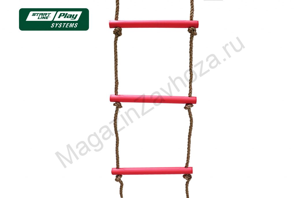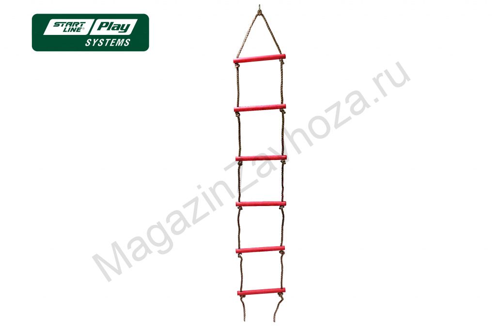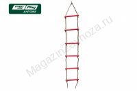 Лесенка с пластиковыми перекладинами имеет одно подвесное кольцо сверху. Узлы типа ‘сквозь и вокруг’ не позволяют ступенькам проворачиваться.