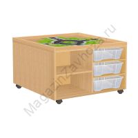 Из ЛДСП Бук или Цветного Кромка ПВХ. УФ- печать. Размеры:965х965х580мм Вес:61кг Объём:0,2м/куб Контейнер ПВХ:300х420х100мм - 6шт. Установлены пластиковые или усиленные поворотные прорезиненные колеса. 2 из них со стопором (тормозом).