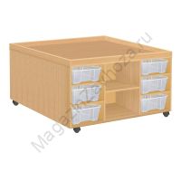 Из ЛДСП Бук или Цветного Кромка ПВХ. Размеры:965х965х580мм Вес:71кг Объём:0,3м/куб Контейнер ПВХ:300х420х100мм - 12шт. Установлены пластиковые или усиленные поворотные прорезиненные колеса. 2 из них со стопором (тормозом).