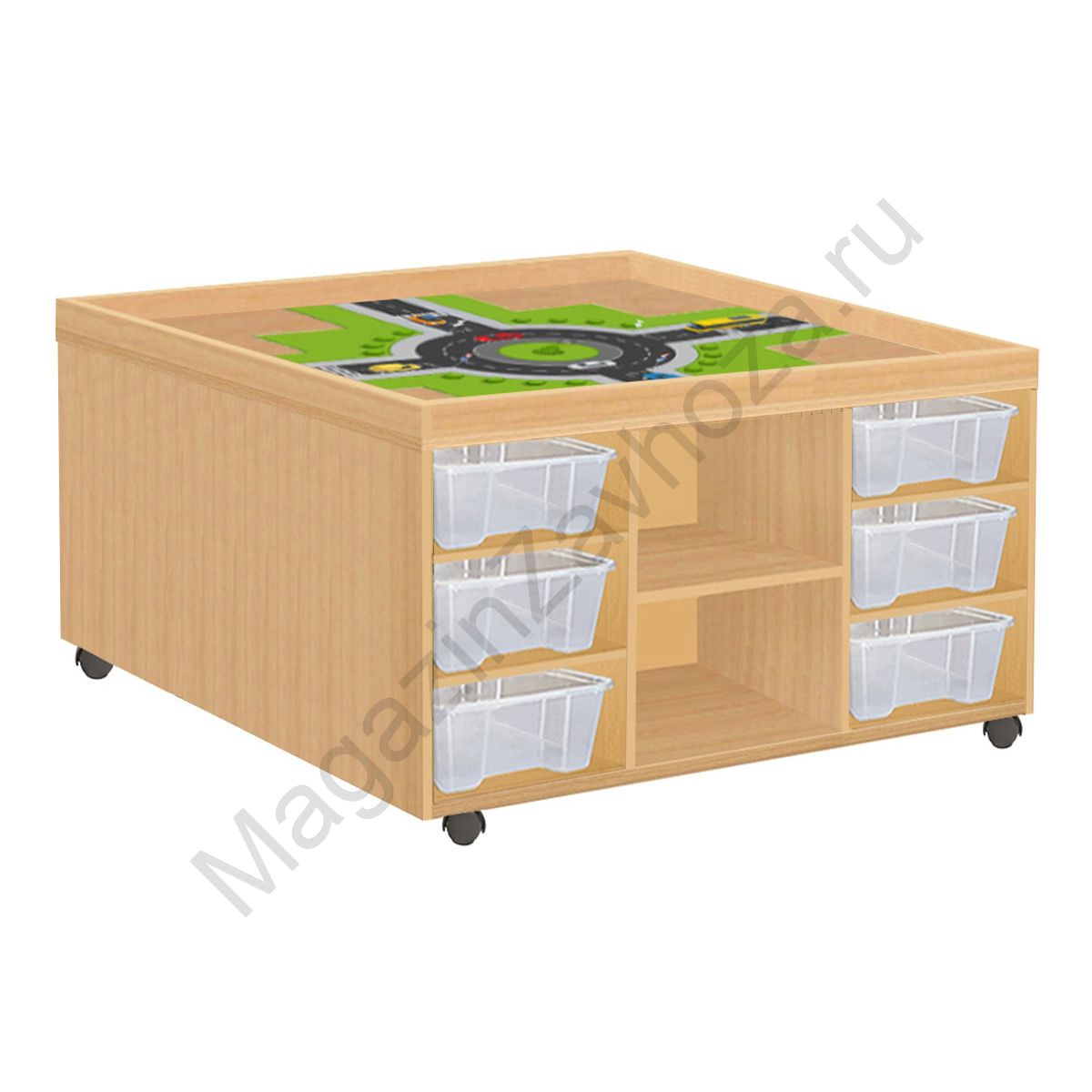 Из ЛДСП Бук или Цветного Кромка ПВХ. УФ- печать. Размеры:965х965х580мм Вес:71кг Объём:0,3м/куб Контейнер ПВХ:300х420х100мм - 12шт. Установлены пластиковые или усиленные поворотные прорезиненные колеса. 2 из них со стопором (тормозом).