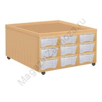 Из ЛДСП Бук или Цветного Кромка ПВХ. Размеры:965х965х580мм Вес:73кг Объём:0,3м/куб Контейнер ПВХ:300х420х100мм - 18шт. Установлены пластиковые или усиленные поворотные прорезиненные колеса. 2 из них со стопором (тормозом).