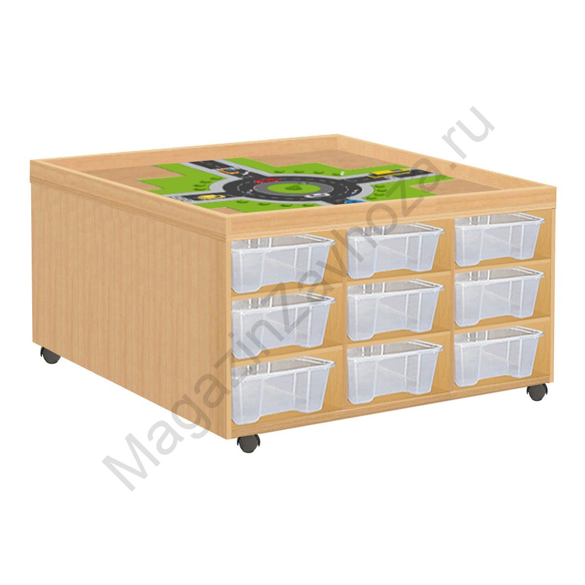 Из ЛДСП Бук или Цветного Кромка ПВХ. УФ- печать. Размеры:965х965х580мм Вес:73кг Объём:0,3м/куб Контейнер ПВХ:300х420х100мм - 18шт. Установлены пластиковые или усиленные поворотные прорезиненные колеса. 2 из них со стопором (тормозом).