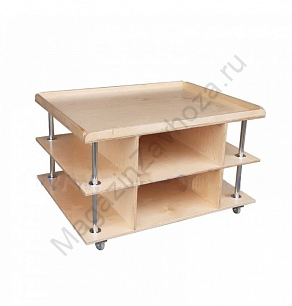 Из Фанеры или ЛДСП Бук; Цветного Кромка ПВХ. Размеры:970х640х580/630мм Вес:25кг Объём:0,05м/куб Установлены пластиковые или усиленные поворотные прорезиненные колеса. 2 из них со стопором (тормозом). Стол двухместный.