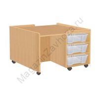 Из ЛДСП Бук или Цветного Кромка ПВХ. Размеры:965х965х500мм Вес:60кг Объём:0,2м/куб Контейнер ПВХ:300х420х100мм - 6шт. Установлены пластиковые или усиленные поворотные прорезиненные колеса. 2 из них со стопором (тормозом).