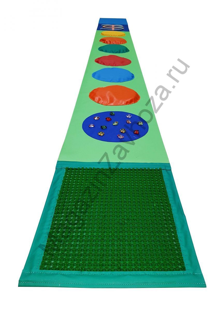 Массажный коврик состоит из зон с разным наполнением. Занятия на дорожке имитируют хождение по различным видам поверхности. При этом происходит массаж стоп малыша, улучшается кровообращение, формируется правильная походка и осуществляется профилактика плоскостопия.<br />Зоны дорожки:<br /><ol><li>Ребристая дорожка</li><li>Сектор с канатом</li><li>Зона с наполнителями</li><li>Сектор с пуговицами</li><li>Щетинистое покрытие «Травка»</li></ol>Дорожка сделана из влагостойкой мебельной винилискожи ярких цветов. В ребристой зоне используются вставки из полых пластиковых трубок диаметром 2 см. В качестве наполнителя для зон дорожки используются: поролон, пенопластовые шарики, песок, продезинфицированные камушки с закругленными краями.