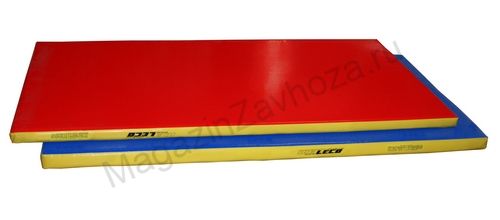 Цвет -- верх-красный, низ-синий, боковина желтая. Чехол -- тентовый материал, это прочный материал, который легко чистится имеет яркий цвет и наиболее подходит для гимнастических матов. Наполнитель -- поролон.