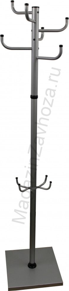 Вешалка напольная Мажор-1 выполнена из оцинкованной стали с полимерным покрытием, утяжеленной квадратное основание, 6 крючков из трубы диаметром 16 мм для верхней одежды равномерно распределены по окружности стойки диаметром 38 мм. Снабжена держателем для зонтов и сумок.Поставляется в разобранном виде, в картонной таре.