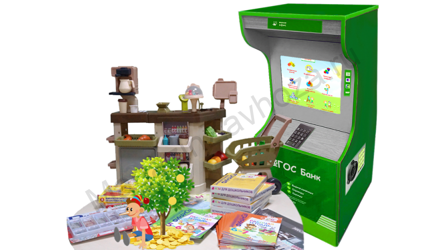 Комплекс "Азбука финансов" разработан в соответствии с программой МинОбр РФ и состоит из интерактивного эмулятора банкомата с игровыми развивающими заданиями, комплекта планов занятий для педагогов по теме «Основы финансовой грамотности» и наборов игрового и методического материалов: