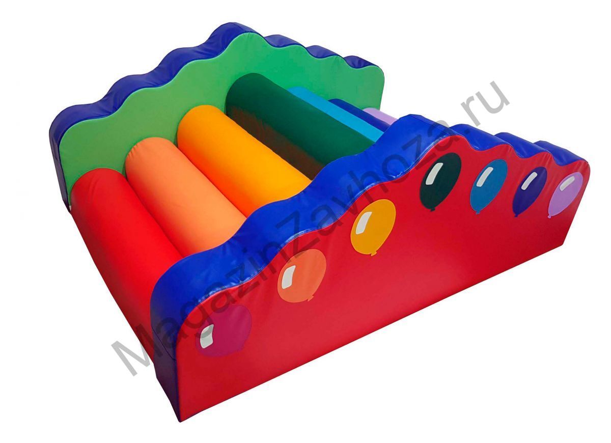 Размер (см): 200*140*80. Модульная горка "Радуга" представляет собой разборную конструкцию состоящую из 7-и валиков и 2-х боковых стенок. На бортах прошита аппликация в виде воздушных шариков. Горка абсолютно безопасна, все модули не содержат острых углов и твердых граней. Материалы изготовления: влагостойкая мебельная винилискожа, поролон.