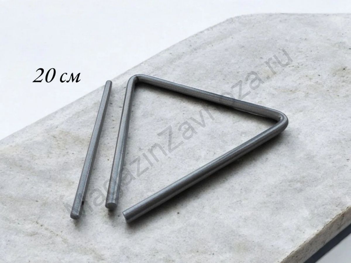 Музыкальный треугольник, длина стороны 20 см, диаметр прутка 10 мм, подвес и палочка для игры в комплекте. Очень тяжёлый, глубокое объёмное красивое звучание.