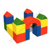 Кожзам и Поролон. Размер:1200х1200х850мм Состоит из 18 модулей. Куб: 300х300х300мм - 8шт. Прямоугольник: 600х200х300мм - 3шт. Прямоугольник: 300х100х400мм - 2шт. Арка: 600х300х300мм - 1шт. Треугольник: 250х250х200мм -4шт. Цвета: Красный,Синий,Желтый,Зеленый