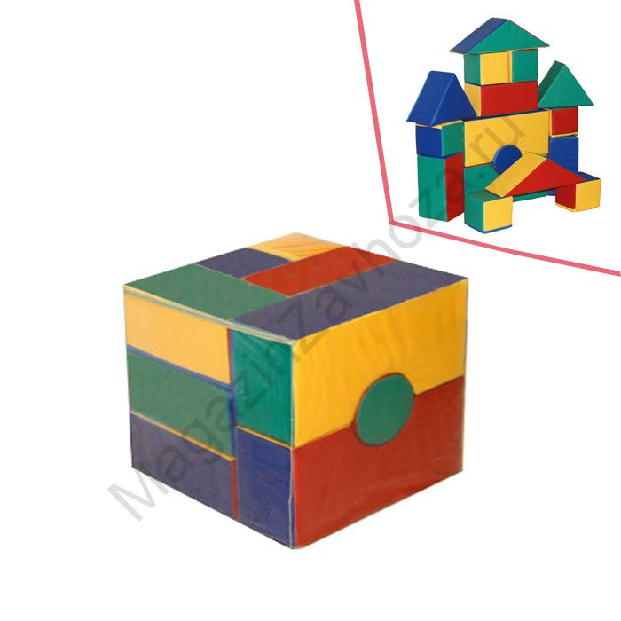 Кожзам и Поролон Размер упаковки:600х600х600 Состоит из 16ти модулей. Куб: 200х200х200мм - 6 шт. Прямоугольник : 400х200х200мм - 3 шт. Треугольник: 600х200х200мм - 2 шт. Треугольник: 400х200х300мм - 2 шт. Мост: 600х200х300мм - 2 шт. Столбик: диам.-200мм , высота-200мм - 1 шт. Цвета: Красный,Синий,Желтый,Зеленый упак.:Вес:5,4кг Объём:0,216м/куб.
