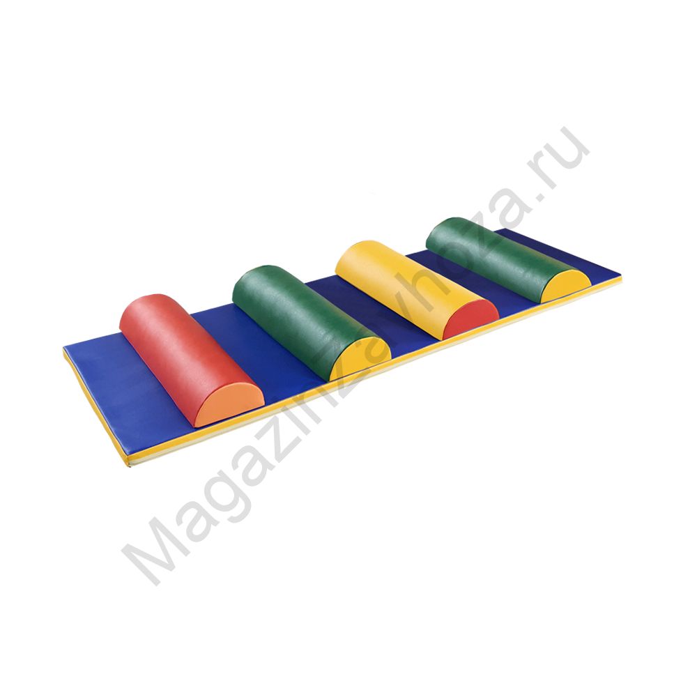 Кожзам и Поролон. Состоит из 5ти модулей. Мат: 1800х600х40мм - 1 шт. Препятствие: 200х600х100мм - 4 шт. Цвета: Красный,Синий,Желтый,Зеленый (можно другие цвета) (вес 4кг 0,15м/куб)